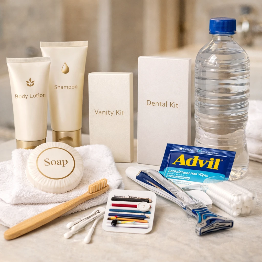 - Bathroom Amenities – Branding Hotel Name & Logo - Shaving Kit (razor + gel)
