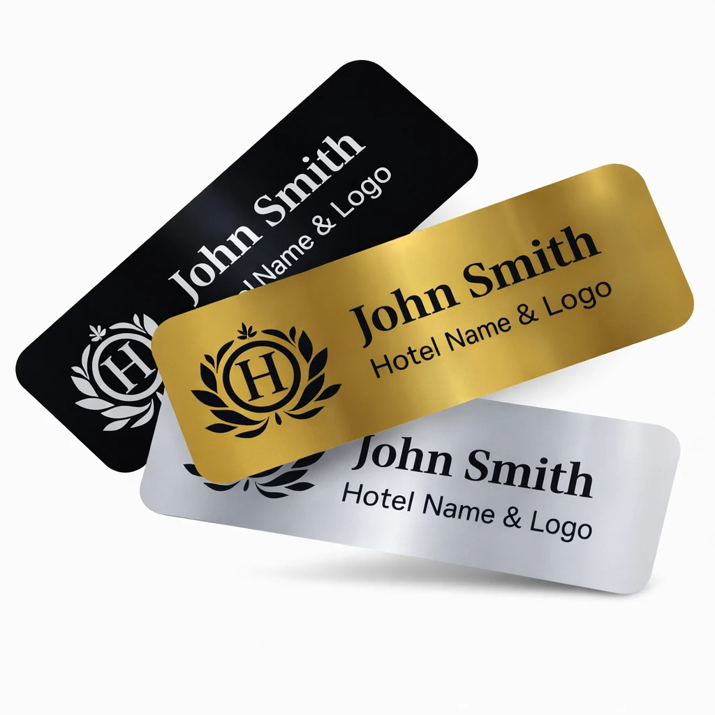 These name badges look smart and professional. The hotel name and logo printing is clear and neat. A simple way to make staff look more organized and welcoming.
